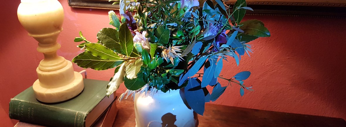 Delightful Bunch with a ‘ just picked’ look tied with raffia, ready to pop in the nearest jar, vase or jug…….So lovely to include organic Somerset garden grown plant material in tune with the seasons as though someone had walked along picking exactly what they liked. In the summer, maybe a handful of Sweet Peas, Honeysuckle, Larkspur and Roses, mixed with Mint, Bay, Rosemary and Tea Tree. In this image it is tightly budded Alstromeiria, Seed heads in blue and maroon, Hydrangea, Eucalyptus and Herbs.