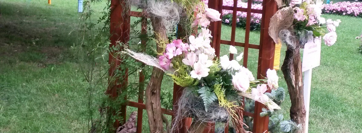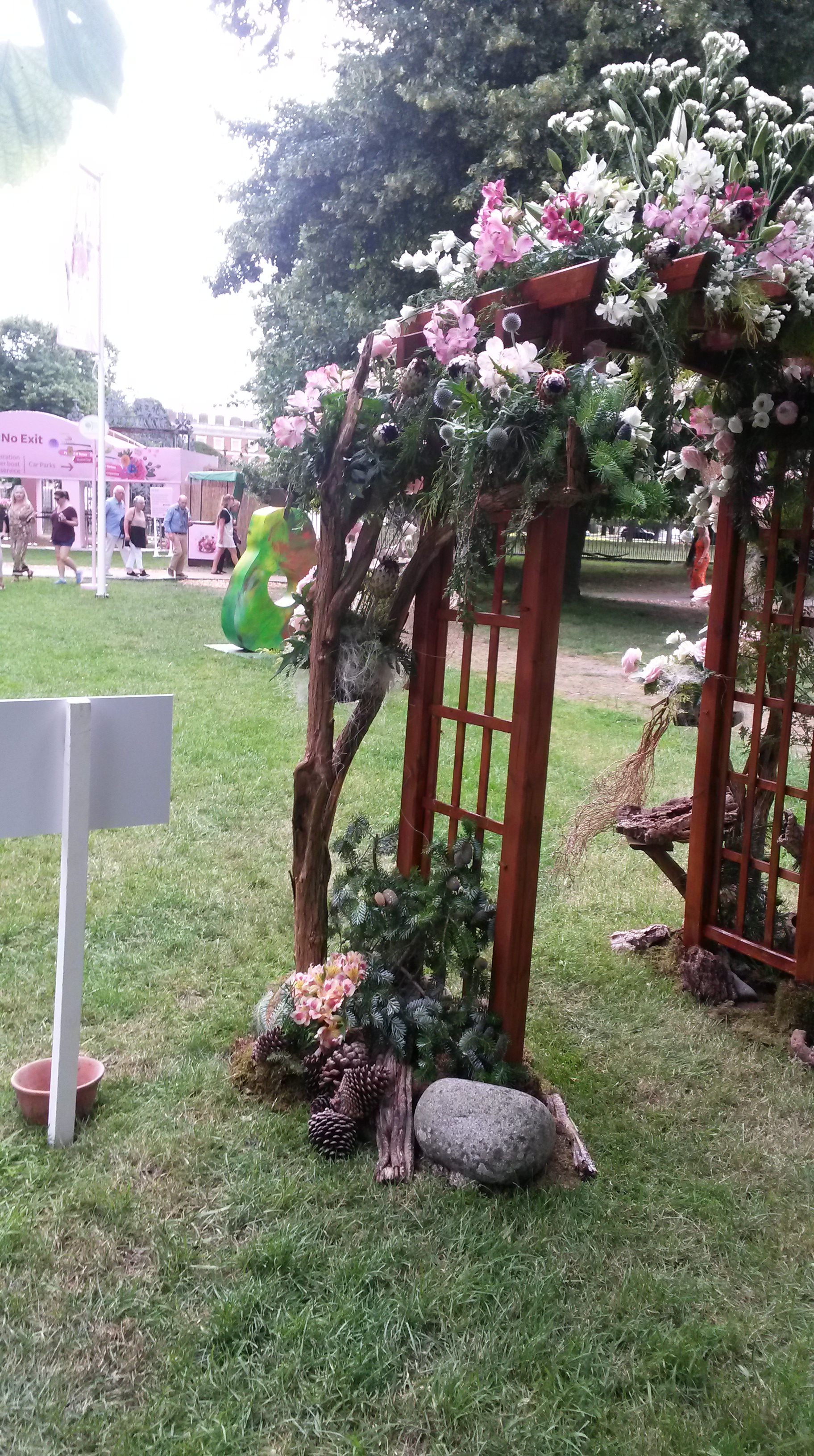 Lost In Beauty depicts an arch of beautiful plant material that has a wonderful scent evoking a feeling of wellbeing. Incorporated at the base are branches, moss and stones indicating a safe haven for wildlife. This large floral installation is made up of cut flowers and foliage including honeysuckly, roses, alstroemeria, Eryngium and other garden material. White and cream clematis and jasmine feature as well as pink summer herbaceous border tones.